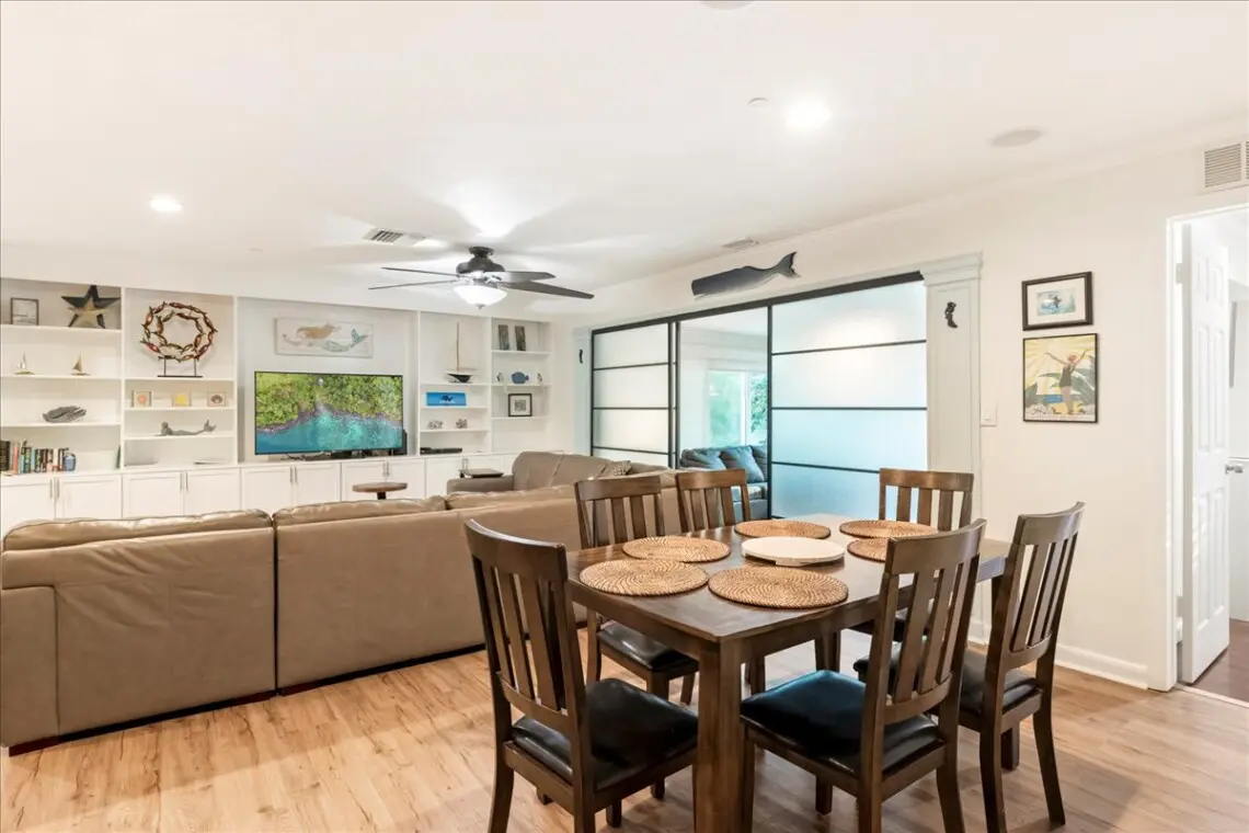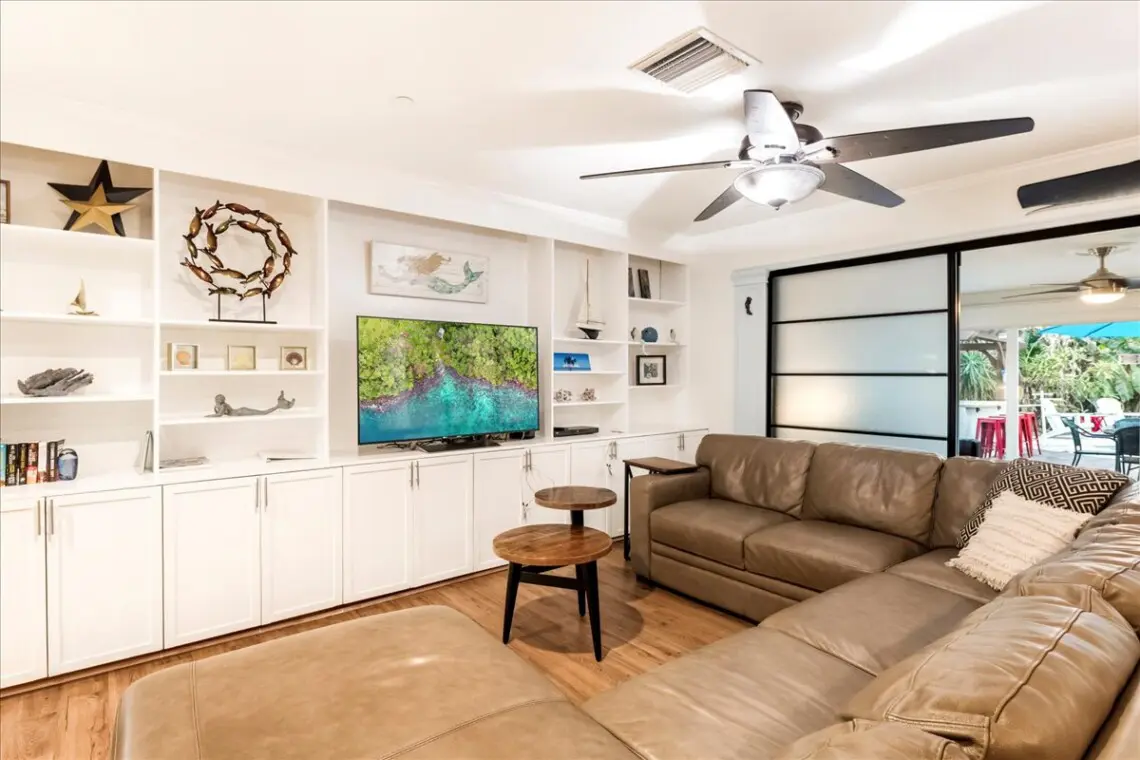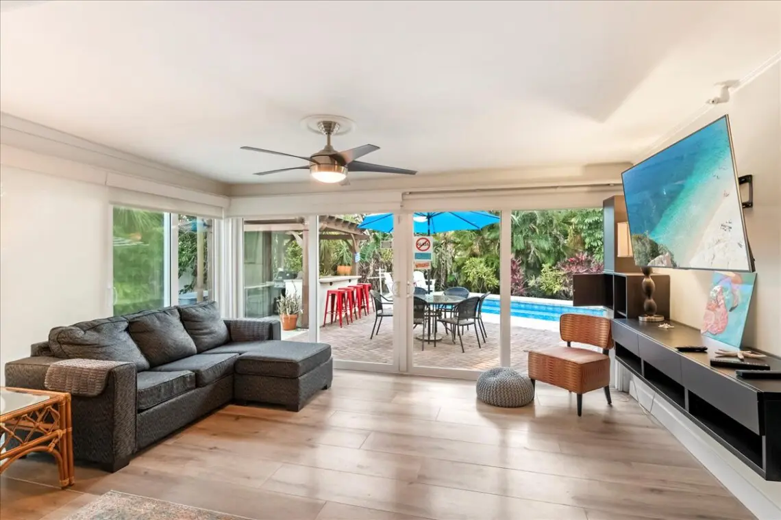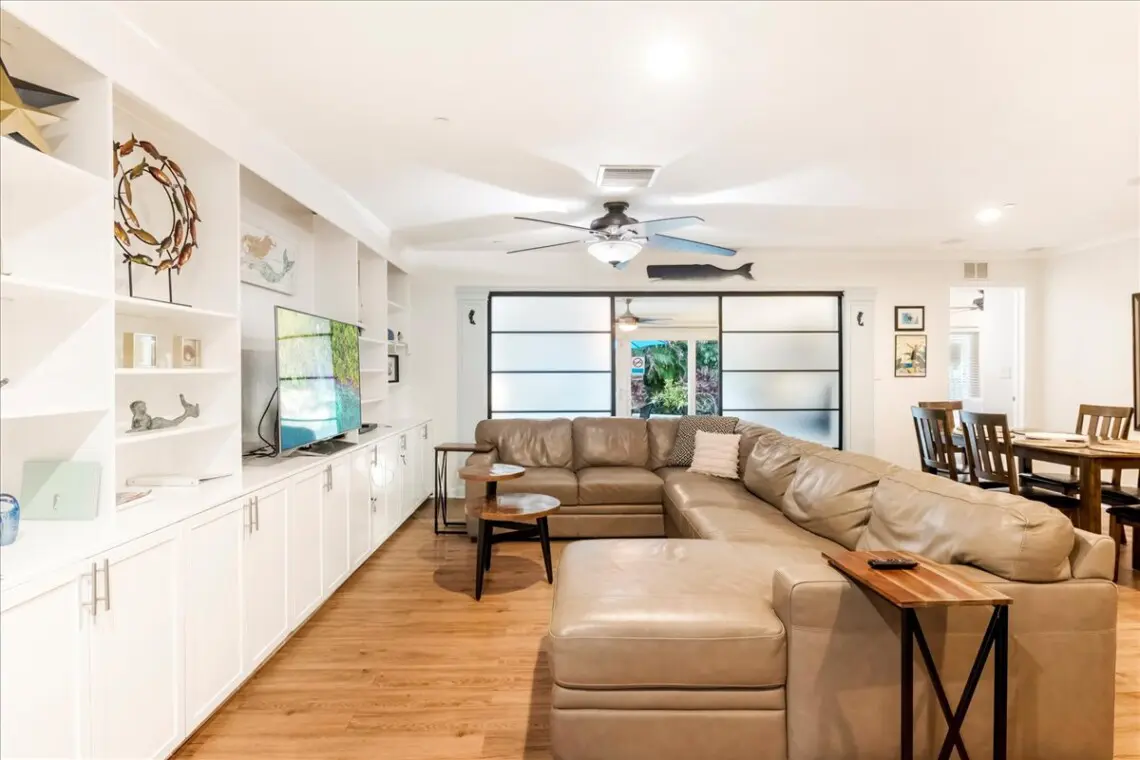 The living room is a cozy central gathering space, perfect for movie nights, relaxing after the beach, or spending quality time together. Comfortable seating and a TV make this an inviting spot for guests of all ages.