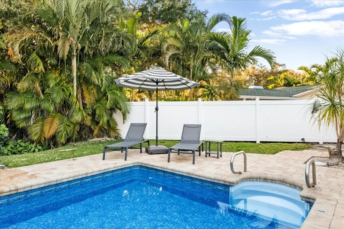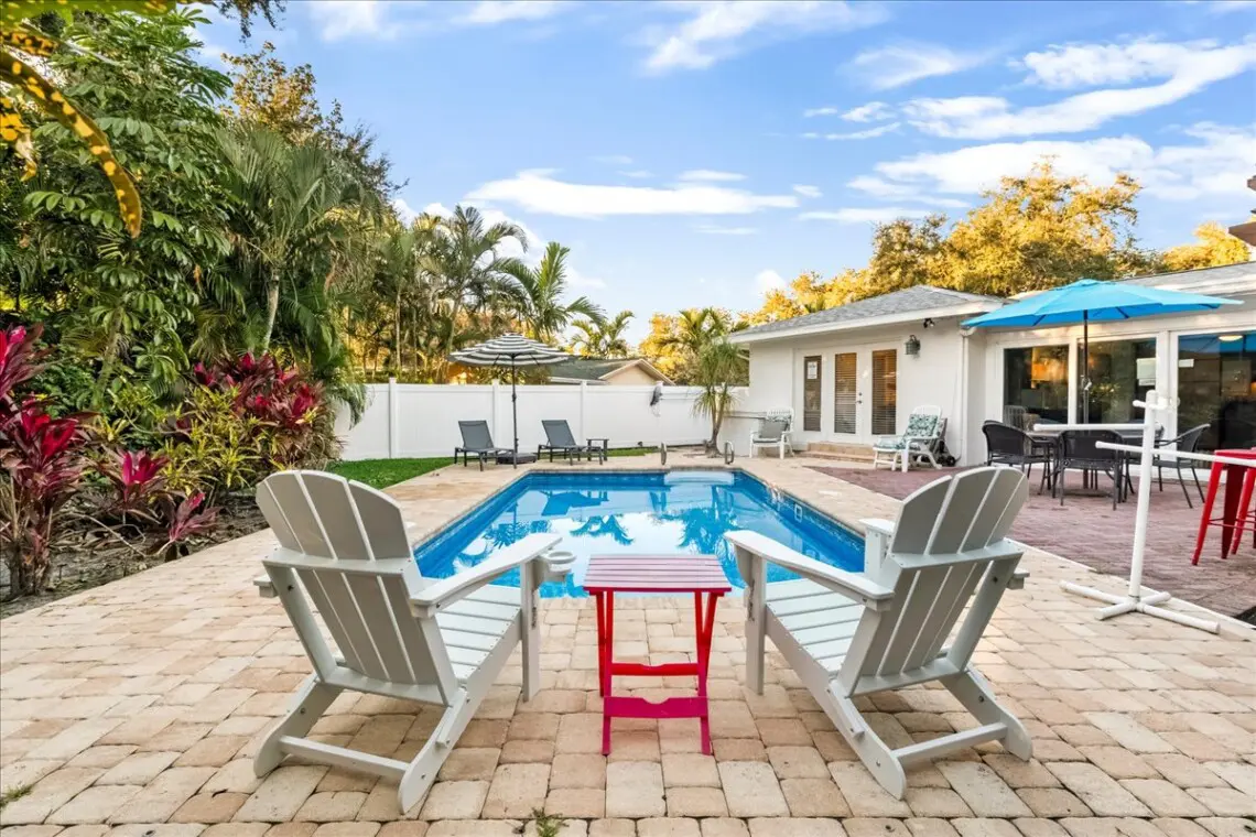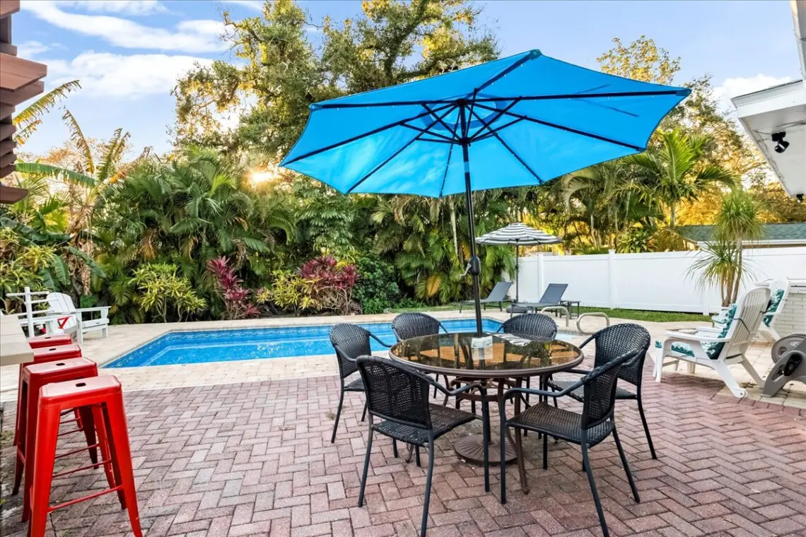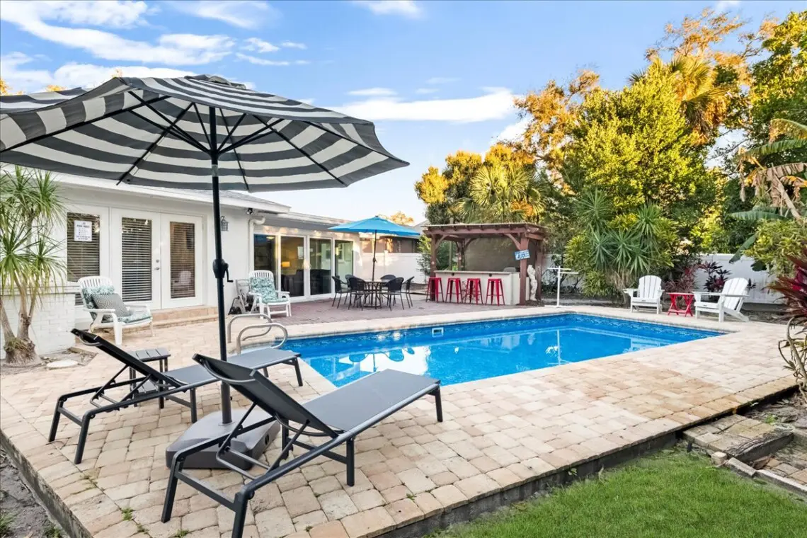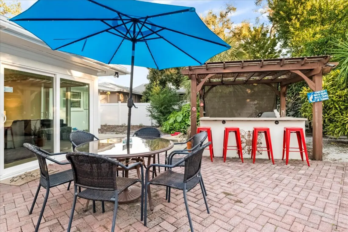 Step outside to your own private backyard retreat with relaxed tiki bar vibes and plenty of space for the whole family to enjoy. Whether you’re lounging, dining outdoors, or getting ready for a beach day, this space is designed for fun and relaxation.