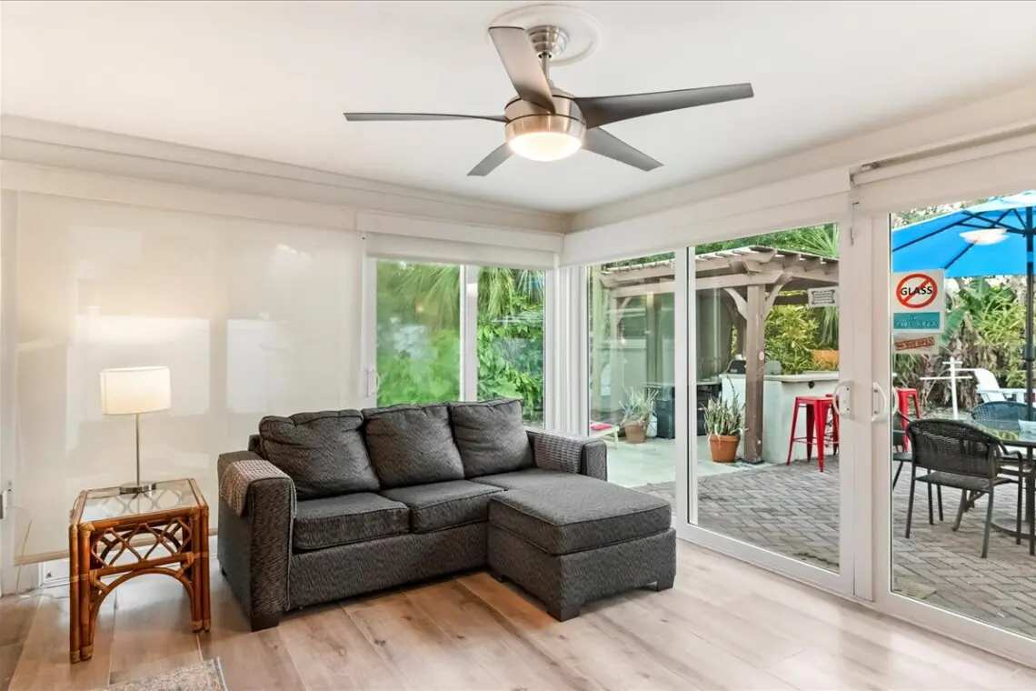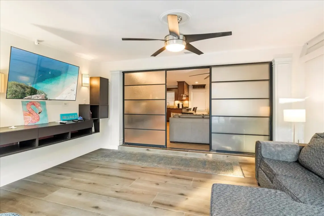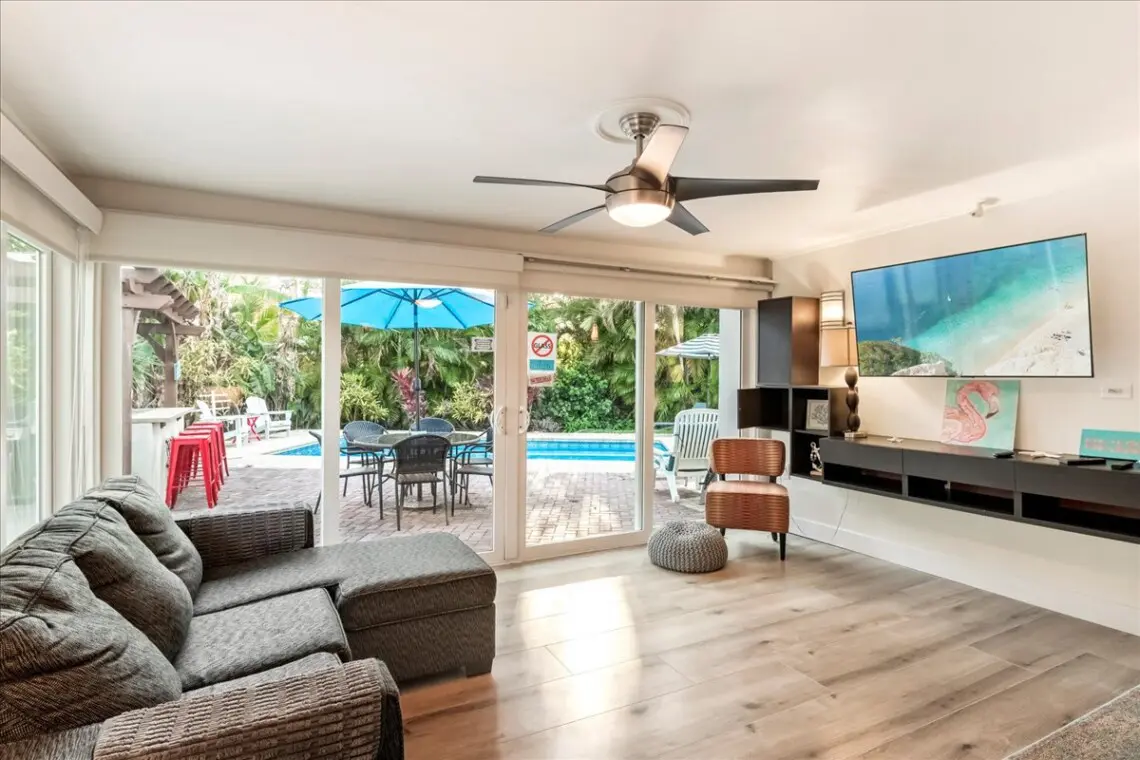 The bonus room is a standout feature of this home — a private, unique space that opens directly to the backyard oasis. It includes a sofa bed and TV, making it perfect as a lounge area, kids’ hangout, or additional sleeping space.
